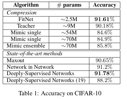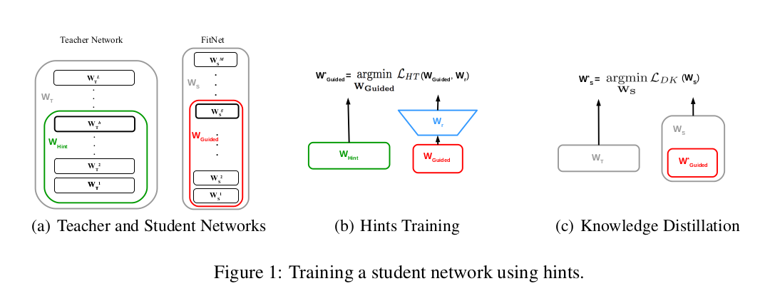 尽管增加网络深度通常能提升性能,但更深层的网络往往非线性更强,这使得基于梯度的训练变得更加困难。近期提出的知识蒸馏(knowledge distillation)方法旨在获得更小、执行更快的模型,其研究表明,学生网络可以模仿大型教师网络或集成网络的软输出(soft output)。本文中,我们扩展了这一思想:不仅使用教师网络的输出,还利用其学习到的中间表征(intermediate representations)作为提示(hints),从而训练出比教师网络更深更窄(deeper and thinner)的学生网络,以提升训练效果和最终性能。由于学生网络的中间隐藏层通常比教师网络的更小,我们引入了额外参数,将学生网络的隐藏层映射到教师网络隐藏层的预测结果上。这种方法可以训练出泛化能力更强或运行速度更快的深层学生网络——这一权衡取决于学生网络的容量选择。例如,在CIFAR-10数据集上,一个参数量减少近10.4倍的深层学生网络,其性能反而超越了更大的前沿教师网络。