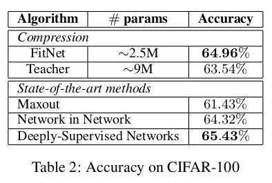 表3显示,尽管仅使用教师网络32%的参数量,我们的FitNet仍取得了与教师相当的准确率,且性能与Maxout和Network in Network等前沿方法持平。