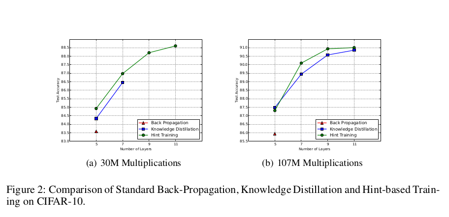由于FitNets的深度较大且容量较小,它们很难训练。如图2(a)所示,使用标准反向传播,我们无法成功训练超过5层的30M乘法次数的网络。而使用知识蒸馏(KD),我们成功地训练了最多7层的网络。将KD中的教师交叉熵加入到训练目标函数中(公式(2))会更加关注容易的样本,即那些教师网络非常确信的样本,并可能导致训练成本的一个更平滑版本(Bengio, 2009)。尽管有一些优化上的好处,但值得注意的是,知识蒸馏训练仍然受到深度增加的限制,在7层网络时达到其极限。相比之下,基于提示的训练(HT)能够缓解这些优化问题,并成功训练了13层的30M乘法次数的网络。HT与KD之间的唯一区别在于参数空间的起始点:随机选择还是通过教师的提示获得。一方面,高度非线性函数(如非常深的网络)中局部极小值和鞍点的激增表明,在参数空间中随机找到一个好的起始点是困难的(Dauphin et al., 2014)。另一方面,图2(a)的结果表明,基于提示的训练(HT)可以引导学生网络到达参数空间中更好的初始位置,从而通过随机梯度下降来最小化代价函数。因此,从优化的角度来看,HT提供了显著的好处。此外,当固定容量和层数时,使用HT训练的网络往往比其他训练方法表现出更好的测试性能。例如,在图2(b)中,使用提示训练的7层网络相比未使用提示的模型,在测试集上获得了+0.7%的性能提升(准确率从89.45%提高到90.1%)。正如Erhan等人(2009)指出的那样,预训练策略可以充当正则化器。这些结果表明,HT是一个比KD更强的正则化器,因为它带来了更好的测试集泛化性能。最后,图2还强调了在固定计算预算下,更深的模型表现优于较浅的模型。事实上,考虑使用提示训练的网络,11层网络相比5层网络在107M乘法次数的情况下绝对提升了4.11%,在30M乘法次数的情况下绝对提升了3.4%。因此,实验验证了我们的假设:在固定计算量的情况下,我们可以通过增加模型的深度来实现更快的计算和更好的泛化性能。