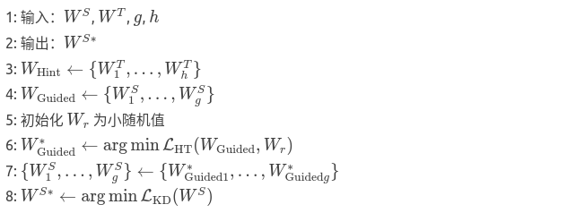 输入:教师网络的已训练参数 WT、FitNet的随机初始化参数 WS,以及分别对应提示层和引导层的索引 h 和 g。设 WHint为教师网络至提示层 h的参数,WGuided 为FitNet至引导层 g的参数,Wr为回归器参数。第一阶段基于教师提示层的预测误差预训练学生网络至引导层(第4行);第二阶段对整个网络进行知识蒸馏训练(第6行)。
