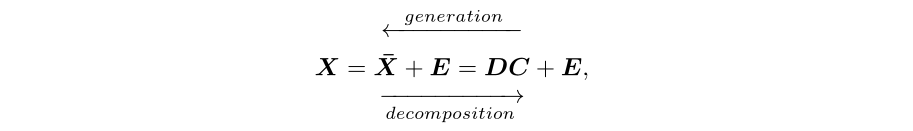 假设给定的数据被排列为一个大矩阵的列 X = [ x 1 , . . . , x n ] ∈ R d × n X=[x_1,...,x_n] \in R^{d \times n} X=[x1,...,xn]∈Rd×n。一般的假设是 X X X中隐藏着一个低维子空间,或多个子空间的并集。这里存在一个字典矩阵 D = [ d 1 , . . . , d r ] ∈ R d × r D=[d_1,...,d_r] \in R_{d \times r} D=[d1,...,dr]∈Rd×r,对应编码 C = [ c 1 , . . . , c n ] ∈ R r × n C=[c_1,...,c_n] \in R^{r \times n} C=[c1,...,cn]∈Rr×n,则矩阵 X X X可以按照如下表示: