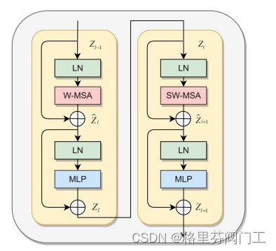 同时,swin transformer部分如上图所示,attention模块不再是关注全局,而是分两步,每一步每个patch都只考虑周围的几个patch进行计算,SW-MSA的区别是会对图像整体往左上移动,消失的部分从右边和下面冒出来,然后计算MSA。具体操作见这篇文章:SW-MSA