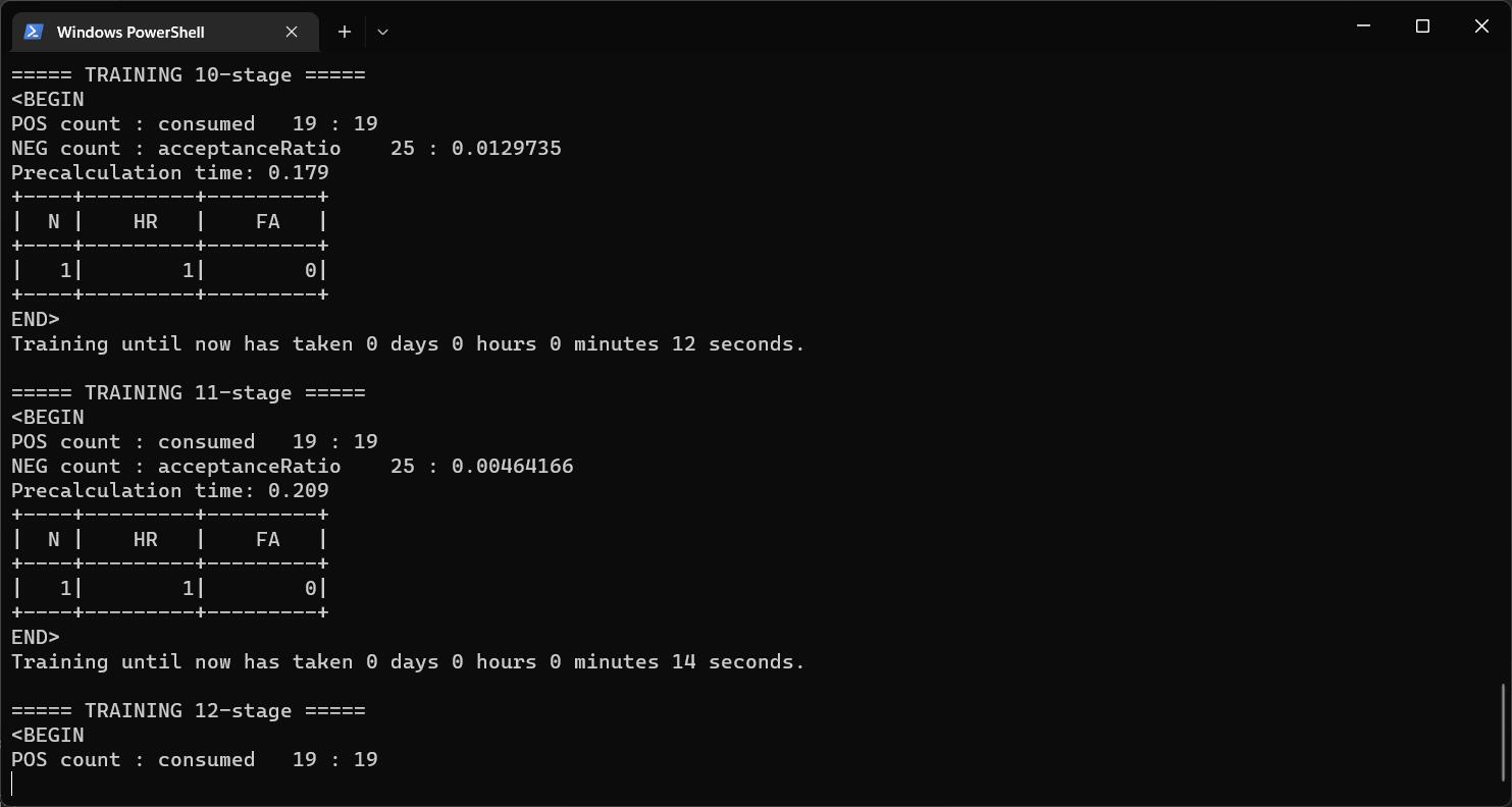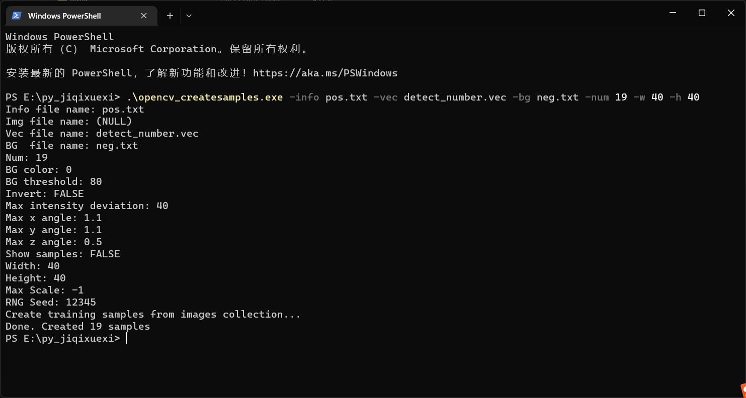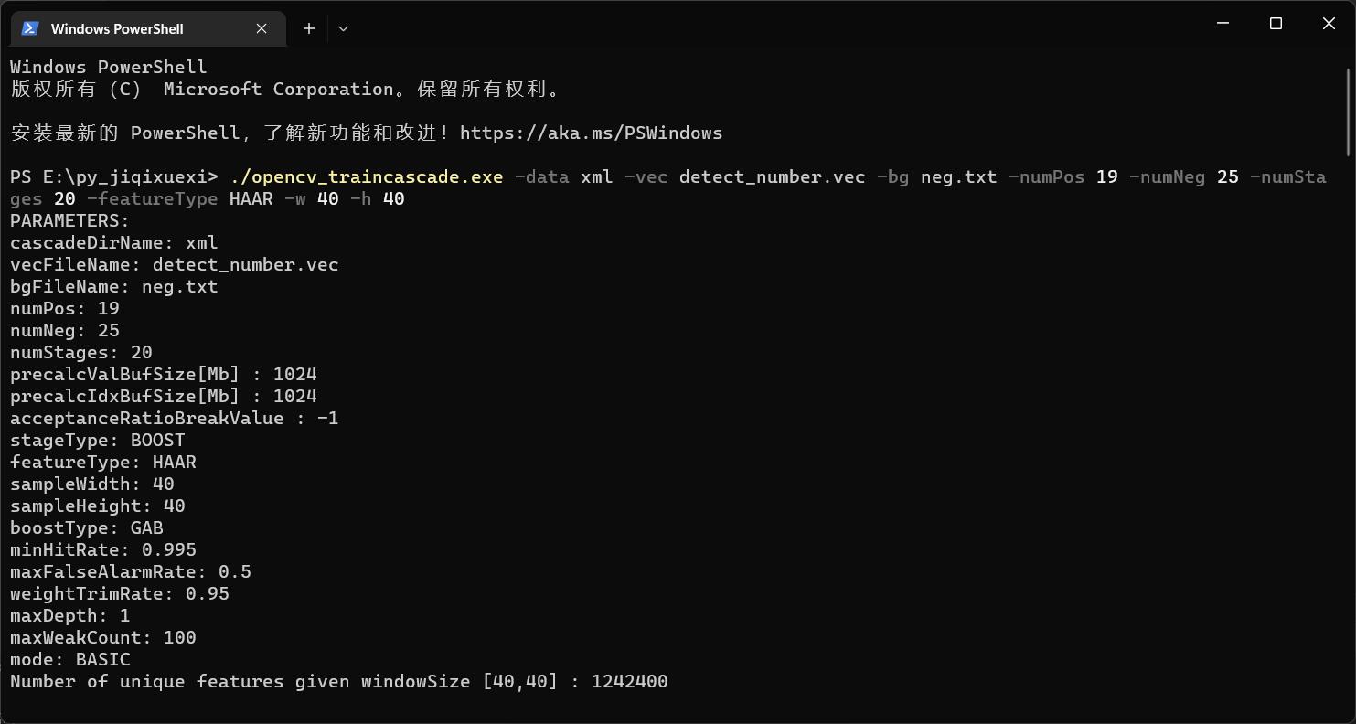 ./opencv_traincascade.exe -data xml -vec detect_number.vec -bg neg.txt -numPos 19 -numNeg 25 -numStages 20 -featureType HAAR -w 40 -h 40-data 前面创建好的xml文件夹
