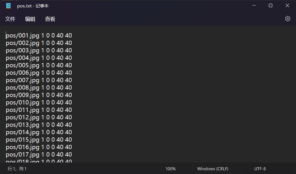 其中"1"为图片数量(0,0)坐标,(40,40)是正样本集的长宽