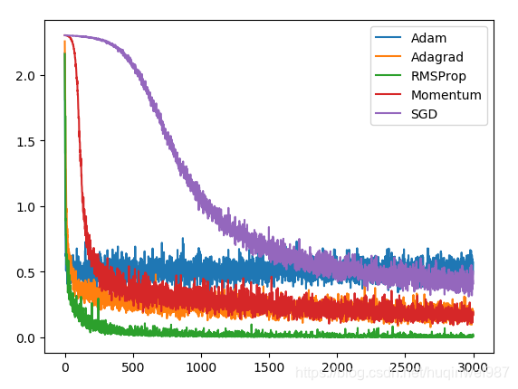 如图:可以看到,Adagrad学习率衰减而被Momentum追上甚至有点反超的趋势,在RMSProp已经被逆转了。