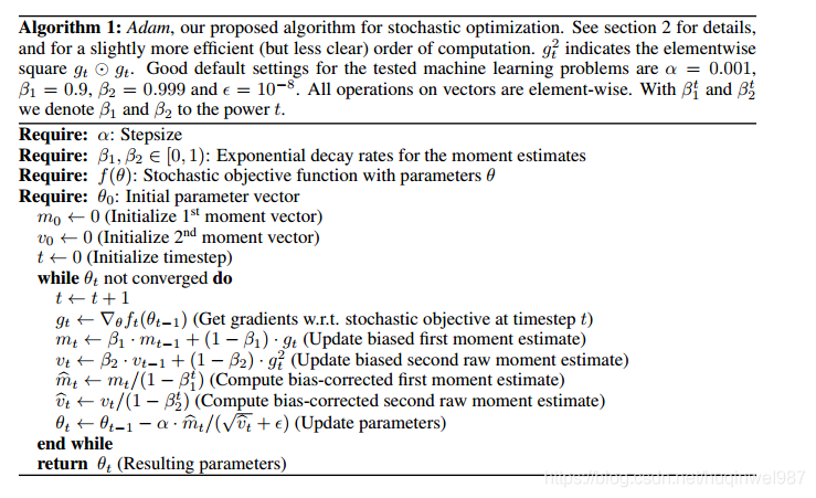 声明,本书代码可能不是唯一甚至标准实现,所以会有些困惑,尤其参考代码中的lr_t。和我常见的如下版本就不同,感觉这个参考版本更直接,他的bias-correction(初始化偏差修正)很直接,而本例中加入了另一个因素。当然,原版Adam可能也不止一种实现,时间关系,暂时也不展开分析了。