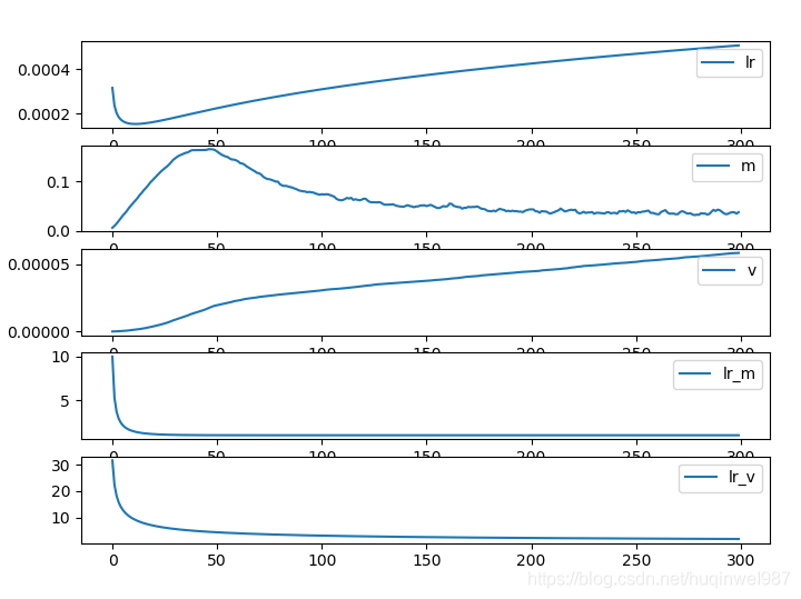 我进行拆解之后,lr_m和lr_v就一致了,都是初期高的一个补偿(合并到lr会出现“nike”是因为,他们分别是分子和分母,两个分别是0.9和0.999,补偿倍率不一致出现的波动,没有太多意义)