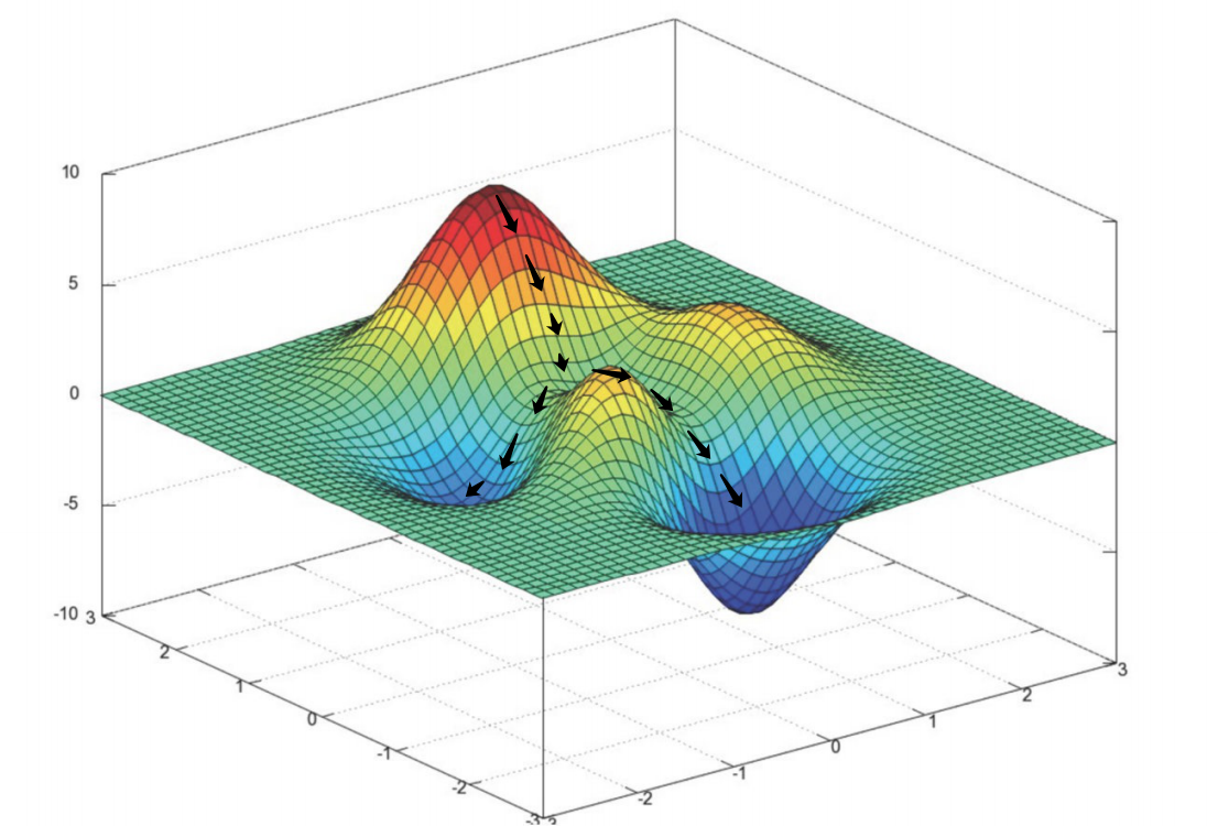 根据场景假设,最快的下⼭的⽅式就是找到当前位置最陡峭的⽅向,然后沿着此⽅向向下⾛。
