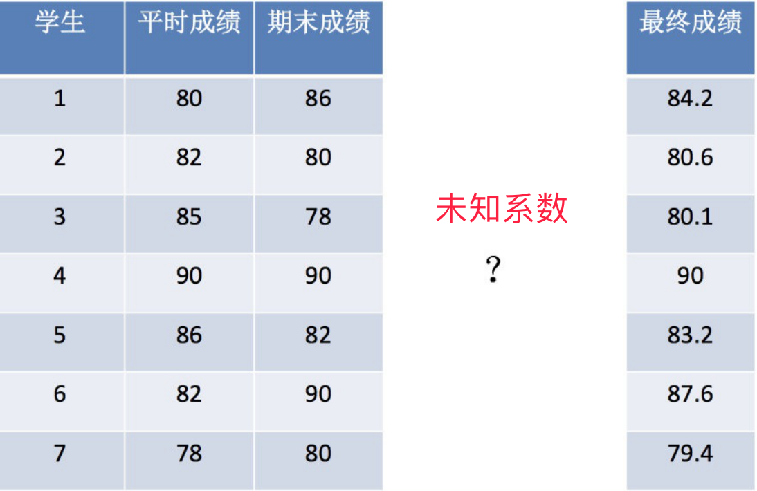 后面会详细讲,这里只是简单举例。就用前面计算期末成绩那个例子,假设现在有如下成绩,我们通过线性回归求出未知系数,得出平时成绩、期末成绩与最终成绩的关系,然后输入新成绩进行预测。