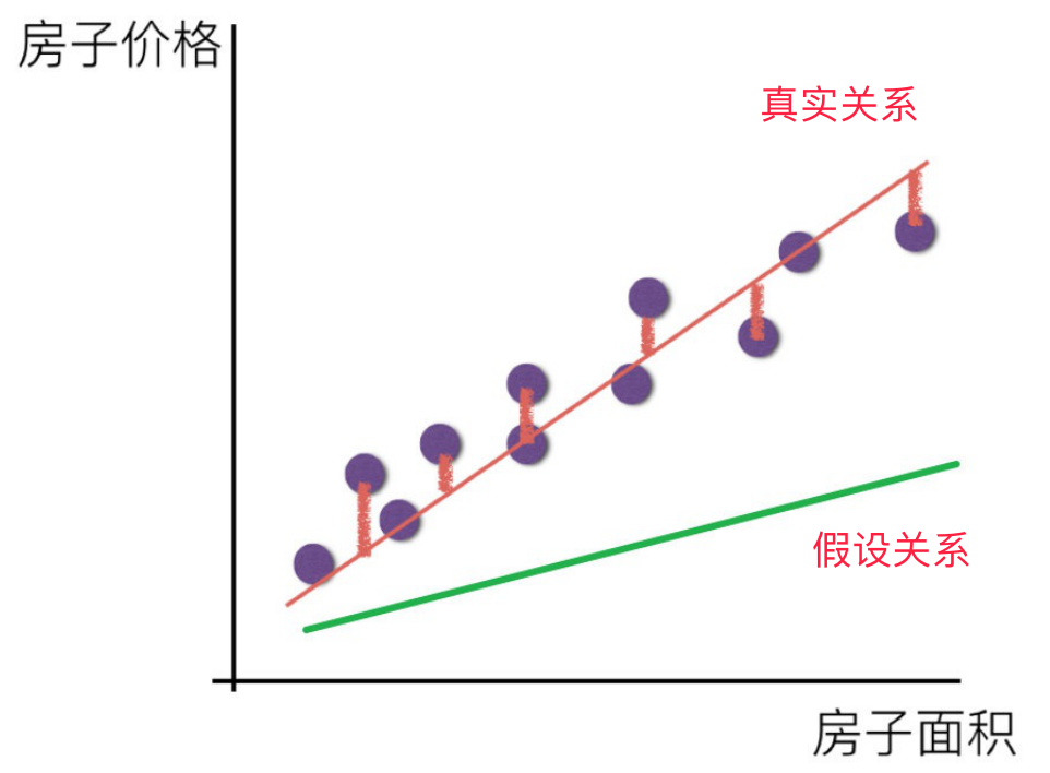 这样得出的房子价格肯定就存在一定误差,就像下图,这个误差也称为损失,最终目标就是让这个损失减少。