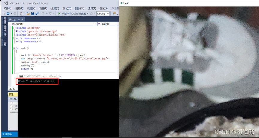 测试结果:输出了OpenCV版本号和图片,表示配置成功!