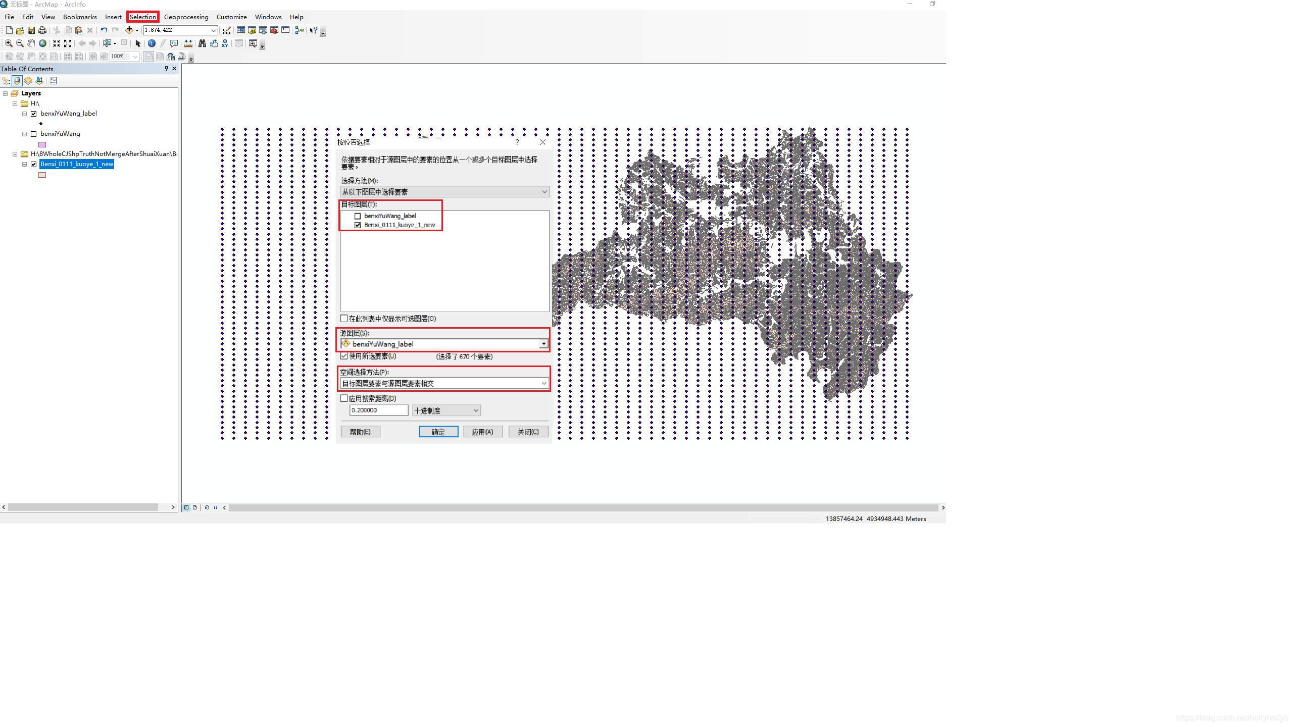 5. 根据“点”shp文件,如下图所示,从菜单“选择”->“按位置选择”,打开对话框,设置目标图层为“面”要素,源图层为“点”要素,按“OK”,选两者相交的要素