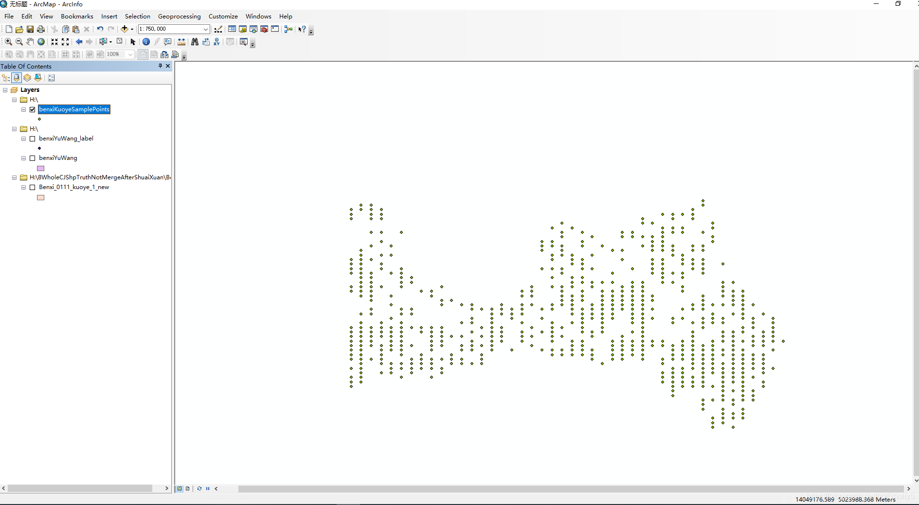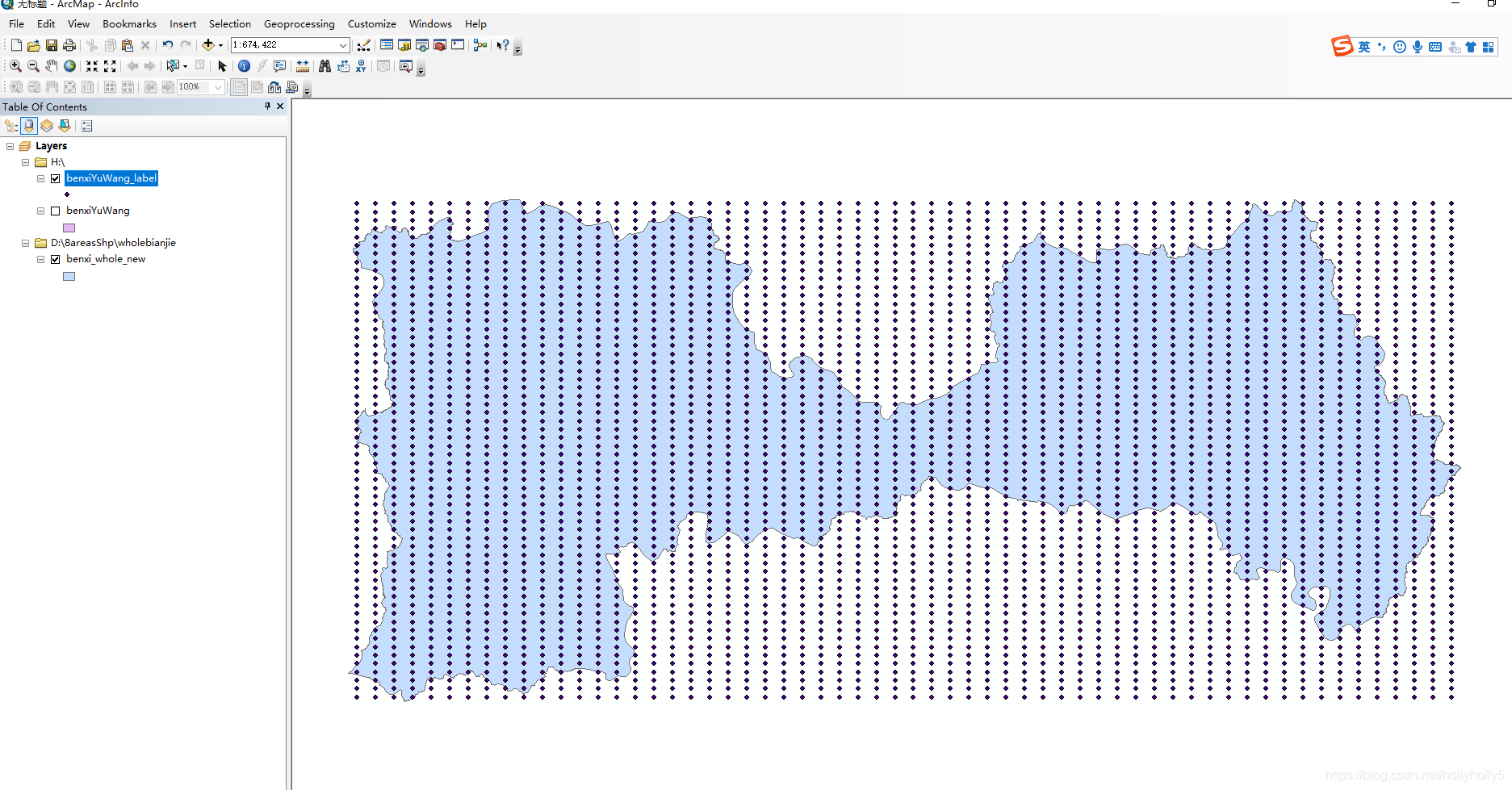 已有图层包含大量各类面要素,如果全部样本用于分析,时间很长,故考虑从大量样本中的每一类中采集少量样本用于分析。1. 打开面要素图层,从工具箱中选择“生成渔网”,在打开的对话框中 设置参数如下图所示(红色框出),渔网的密度可以根据各类样本的分布情况,设置相应的密度,设置好参数后,按“OK”2.成功生成渔网,如下图所示3.如上图所示,选择“点”层,右击鼠标,弹出菜单,输出“点”层到Shp文件备用。4.