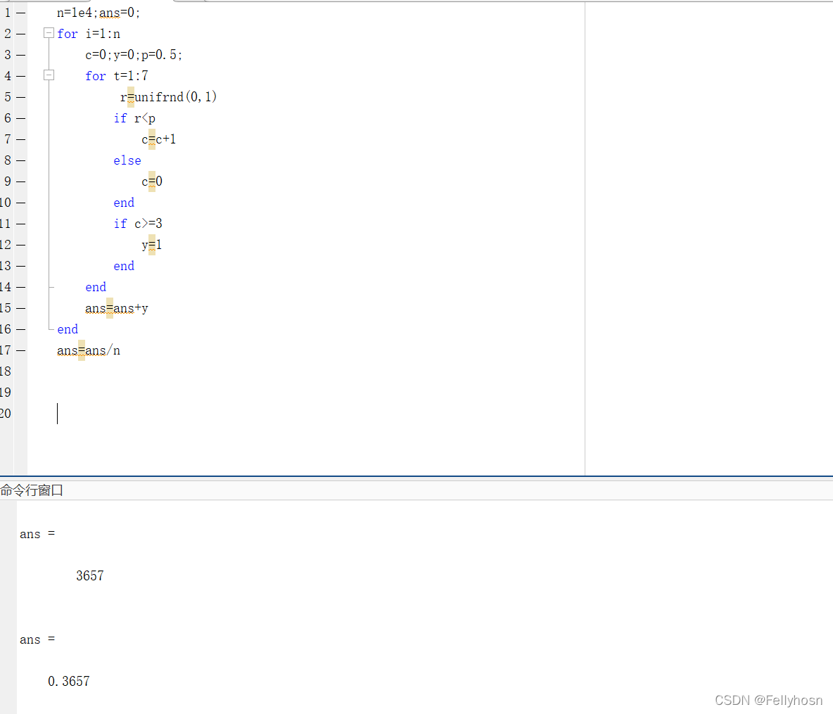 n=1e4表示重复实验10000个星期,得出的结果为有3657个星期是有连续三天下雨的。