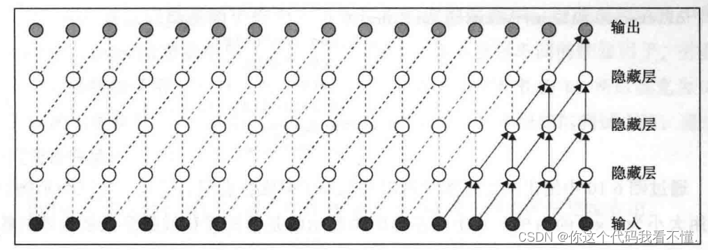 LSTM 网络可以记住实际序列长度为50~100的上下文信息。上图中具有三个隐藏层,这些隐藏层使用上一层的信息。第一层输入通过一维卷积层以生成第层的数据。卷积可以并行完成,这与RNN的场景不同。在 RNN中,每个数据点都需要前一个输人依次传入。为了收集更多上下文,我们可以增加层数。在上图中,位于第五层的输出将从输入层的五个节点获取上下文信息。因此,每一层将增加个输入节点到上下文中。也就是说,如果我们有10个隐藏层,则最后一层将从12个输入节点获取上下文信息。