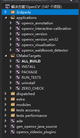 在用cmake构建完opencv工程打开后,解决方案资源管理器中这个样子