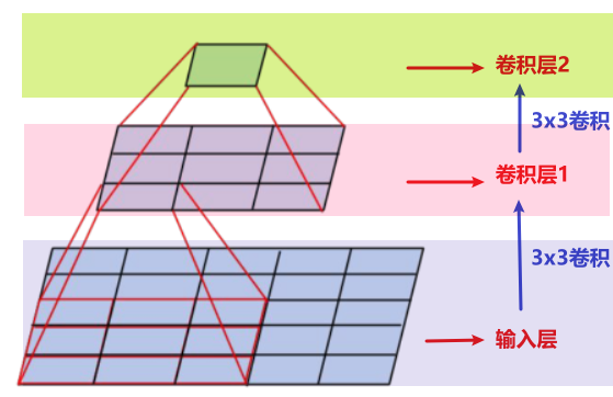 首先从单个3*3的卷积核的谁敢首页来进行靠拢,当我们使用一个3*3的卷积核时,此时它的感受野是3*3;当我们在上述3*3的卷积核的基础上再增加一个3*3卷积核时,此时两个连续3*3的卷积核的感受野变成了5*5,这是因为第二个3*3的卷积核考虑了第一个卷积核输出的3*3的区域,而此时这个区域在原始输入上对应5*5的区域。