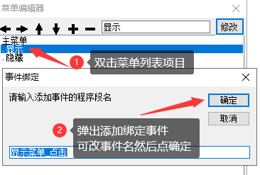 双击二级菜单,也就是显示和隐藏这两个菜单项,弹出添加事件的窗口。