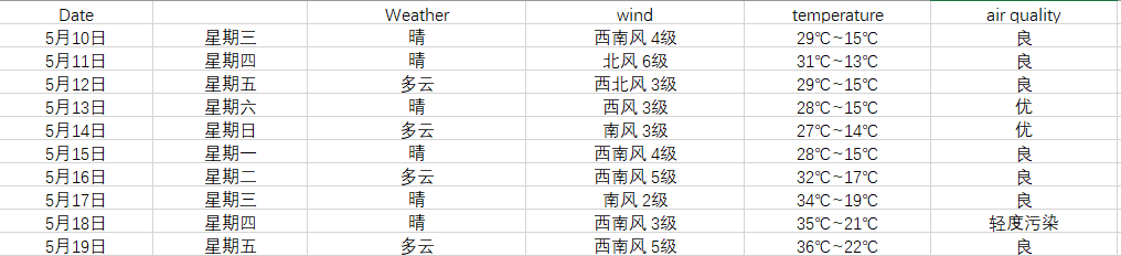 此外,本实验还收集了北京市2017年5月10日-2017年5月19日的日均气温,是否下雨,空气质量数据,数据总体情况如下表3-1 北京市2017年5月10日—2017年5月19日气象数据。
