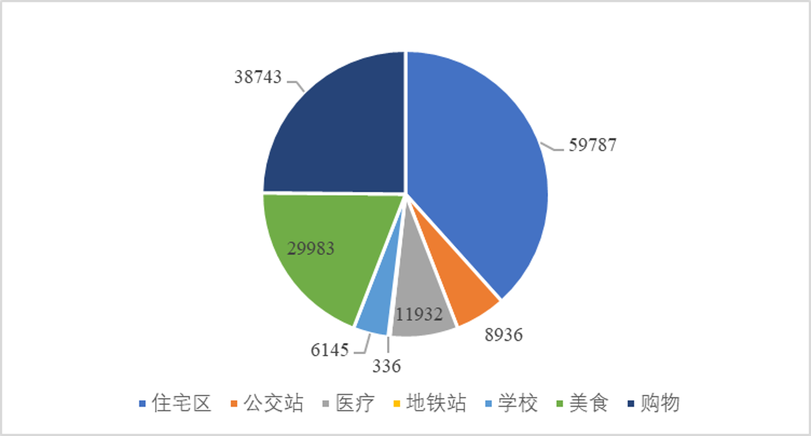 从中可以看到住宅区、美食、购物为主要的三个poi类别,占到了整个poi数量的75%左右。
