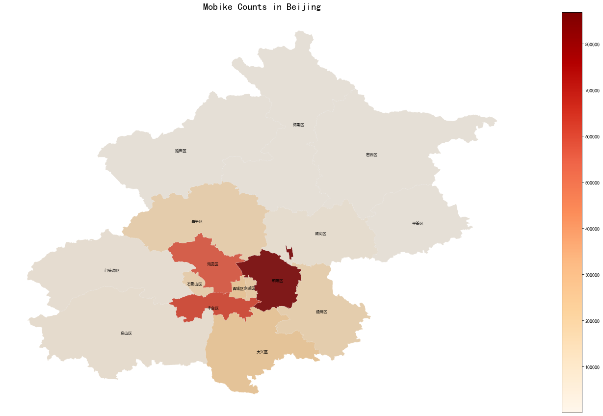 通过摩拜单车数据在北京市不同行政区的空间分布,可以看到骑行具有空间不均匀性,主要分布于朝阳区,丰台区,海淀区等中心城区,且有沿中心圈层向外辐射递减的趋势,特别是在一些外围区域,订单数据稀少。