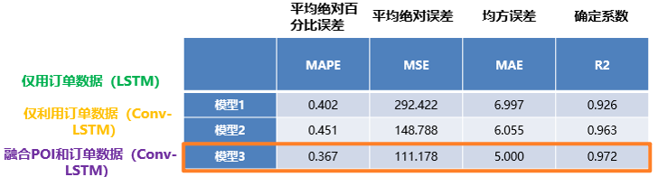 MAPE,MAE,MSE,R2四个指标都显示出,模型3:融合POI和订单数据(Conv-LSTM)是预测最优的。