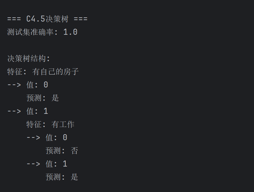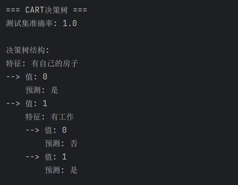 结果展示:递归打印决策树结构,直观显示每个节点的分裂特征和分支条件,以及叶节点的预测结果。