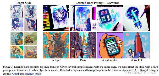 所提出的方法也可以很容易地适应风格迁移。我们遵循Gal等人(2022)使用软提示调查的设置,但使用硬提示。给定几个共享相同样式的示例,我们将其共享的样式特征提取到单个硬提示中,并使用此提示将样式应用于新对象或场景。图3给出了两个样式转移的例子,表明我们的方法可以很容易地在提示符中嵌入共享样式元素,并将它们应用于新概念。模板和学习提示可以在附录A.1中找到。