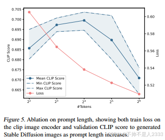 提示长度。我们进一步研究了最佳令牌数量。在图 5 中,我们发现较长的提示在用 Stable Diffusion 生成时并不一定能产生更好的结果,尽管它们在 CLIP 图像编码器上的损失确实有所减少。因此,长提示过度拟合且迁移性较差,我们通过实验发现令牌长度为 16 时能获得最通用的性能。