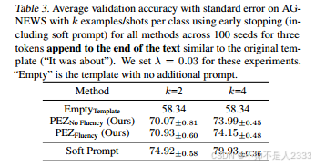 少样本设置。对于少样本设置,我们在 AGNEWS 数据集上使用 GPT-2 Large 对每个提示进行了 100 个周期的优化,我们从每个类别中抽取两个示例(k = 2)和四个示例(k = 4)来获得训练集。