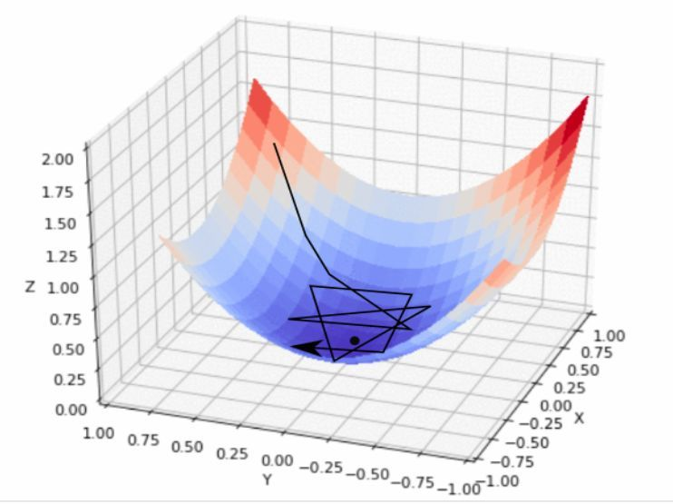 理论上而言,这样很好,因为我们希望当接近一个最小值的时候算法能够采取更小的步长。步长太大有可能导致跳过最小值,并且在最小值脊梁之间来回跳动。