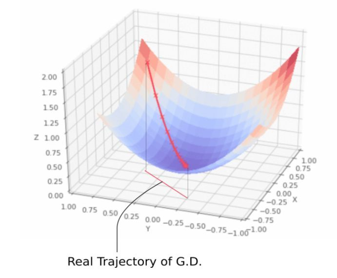 正如上面的动画所描述的,梯度下降并不涉及在 z 轴方向上的移动。因为仅由 x 轴和 y 轴方向描述的权重是自由参数。实际得到的轨迹是定义在 x-y 平面中的,如下图所示: