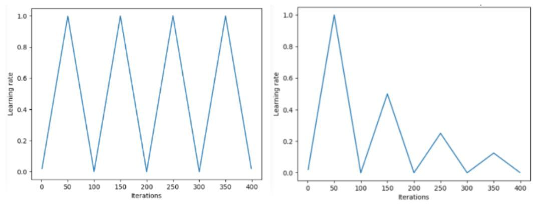 Leslie N. Smith 提出的 Triangular 和 Triangular2 循环学习率方法。左侧的最大学习率和最小学习率保持不变。右侧的区别在于每个周期之后学习率减半。图源:Hafidz Zulkifli