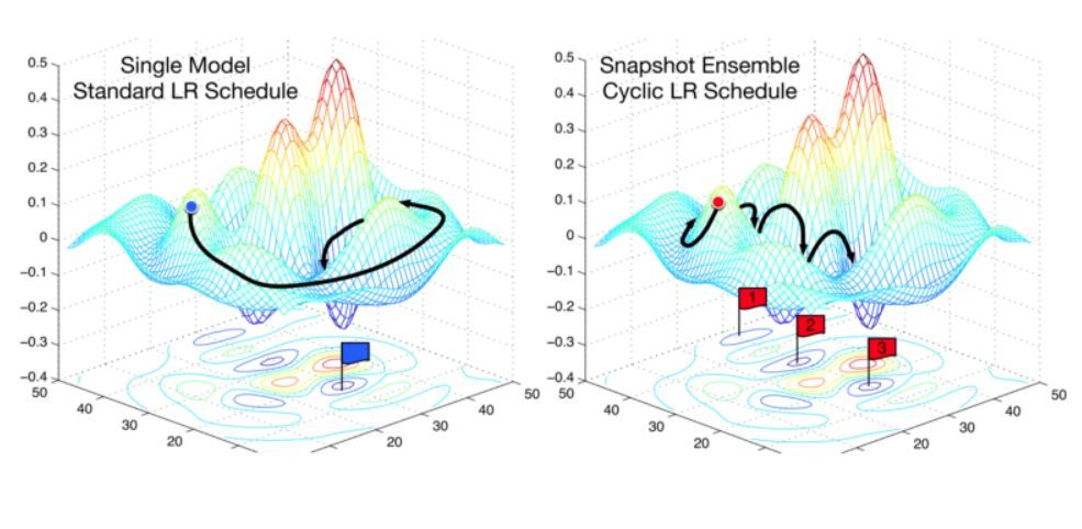 最近的一篇论文介绍了一种叫做「随机加权平均」的技术。作者提出了一种方法,首先收敛到最小值,缓存权重,然后将学习率恢复到更高的值。然后,这种更高的学习率将算法从最小值推到损失面中的随机点。然后使算法再次收敛到另一个最小值。重复几次,最后,他们对所有缓存权重集的预测进行平均,以产生最终预测。