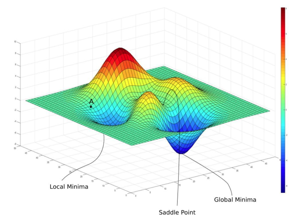 关于梯度下降的局限性,我们得到的基本教训是:一旦到达梯度为 0 的区域,不管极小值点的质量如何,它都几乎无法逃离。我们面临的另一种问题是鞍点,它们的形状如下: