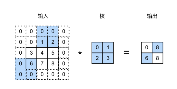 在原输入高和宽的两侧分别添加了值为0的元素,使得输入高和宽从3变成了5,从而使得输出高和宽由2增加到4。