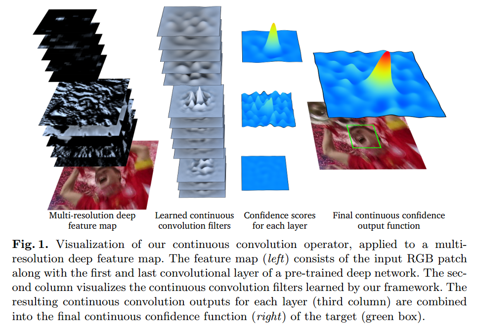 这篇论文提出了一个在连续空间域中学习卷积算子的新型方法。它在训练样本上使用了一个内插模型,学习一组卷积滤波器,对目标物体生成一个连续域置信图(continuous-domain confidence map)。这使得多分辨率特征图在一个联合学习的方法中完美融合。图一展示了在融合多分辨率特征图时,连续卷积算子(continuous convolution operator)操作的可视化。