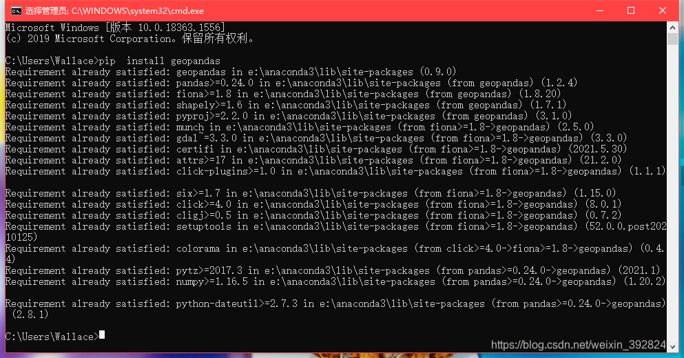 安装完成之后也可以再次使用pip install geopandas查看本机上geopandas依赖的库的版本,当然这其中包括上述的四个库文件啦。