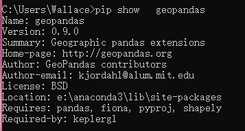 上述过程执行完成之后, 在命令行输入pip install geopandas,会提示successfull install 的,查看pip show geopandas出现下图信息说明安装成功。