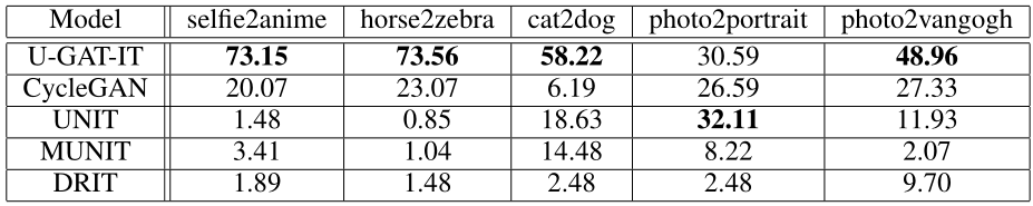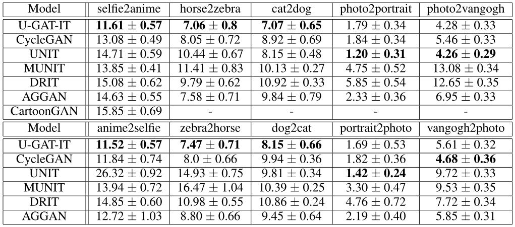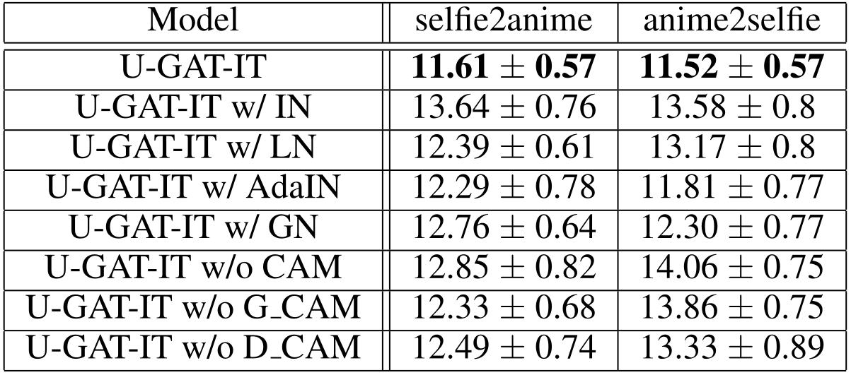 Unsupervised Generative Attentional Networks with Adaptive Layer-Instance Normalization for Image-to-Image Translation 论文精度