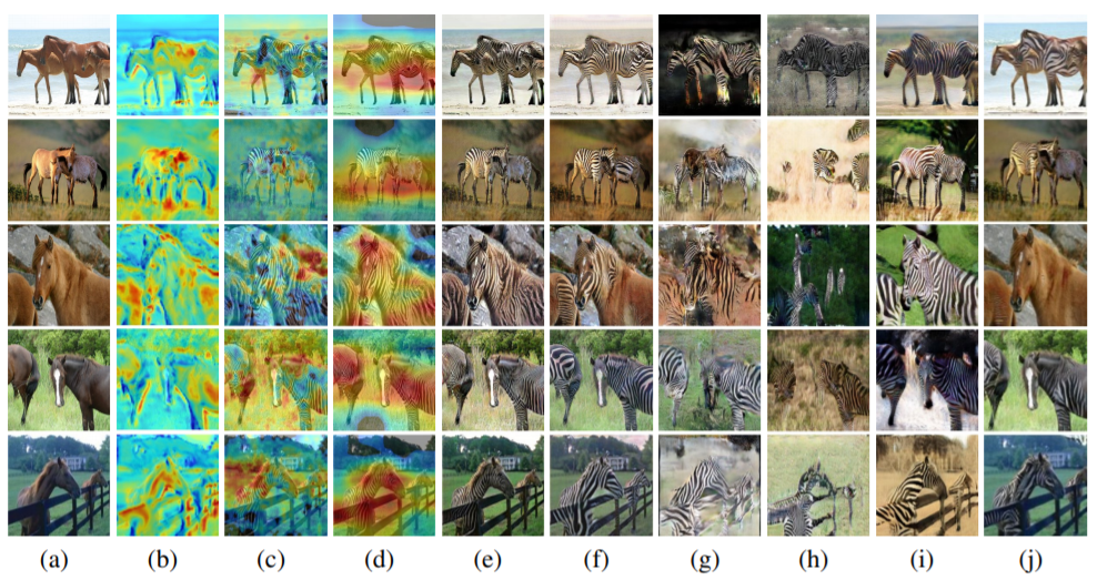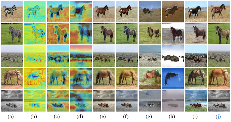 Visual comparisons of the horse2zebra with attention features maps. (a) Source images, (b) Attention map of the generator, (c-d) Local and global attention maps of the discriminators, (e) Our results, (f) CycleGAN (Zhu et al. (2017)), (g) UNIT (Liu et al. (2017)), (h) MUNIT (Huang et al. (2018)), (i) DRIT (Lee et al. (2018)), (j) AGGAN (Mejjati et al. (2018)).