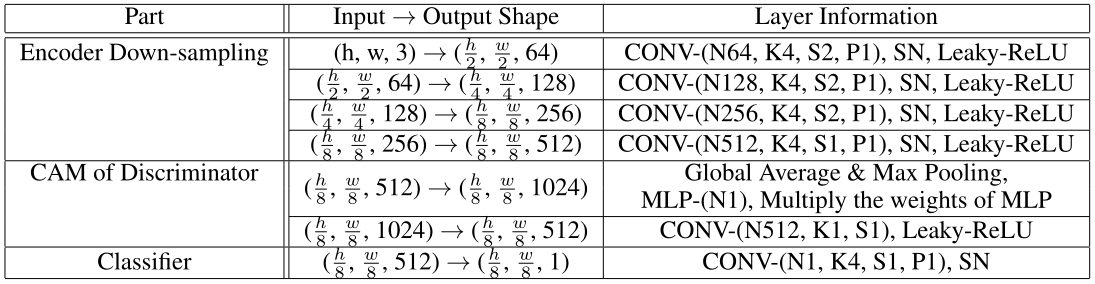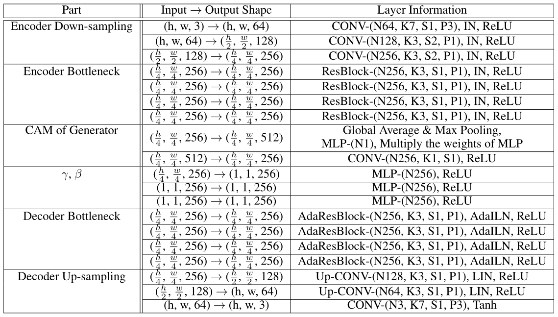 U-GAT-IT 的网络架构如下表所示。该生成器的编码器由2个下采样步长的卷积层和4个残差块组成。生成器的解码 器由四个残差块和两个步长为1的上采样卷积层组成。注意,我们分别为编码器和解码 器使用实例规范化(LN)。一般来说,LN在分类问题上的表现并不比批次标准化(BN)好。由于辅助分类器是从生成器中的编码器连接而来的,为了提高辅助分类器的精度,我们使用实例规范化(LN, 最小批大小为1的批规范化,batch normalization)而不是AdaLIN。光谱归一化(Spectral normalization)用于鉴别器。对于判别器网络我们采用了两种不同比例的PatchGAN,它将局部(70 x 70)和全局(286 x 286)图像补丁进行真假分类。对于激活函数,我们在发生器中使用ReLU,在判别器中使用斜率为0.2的leaky-ReLU
