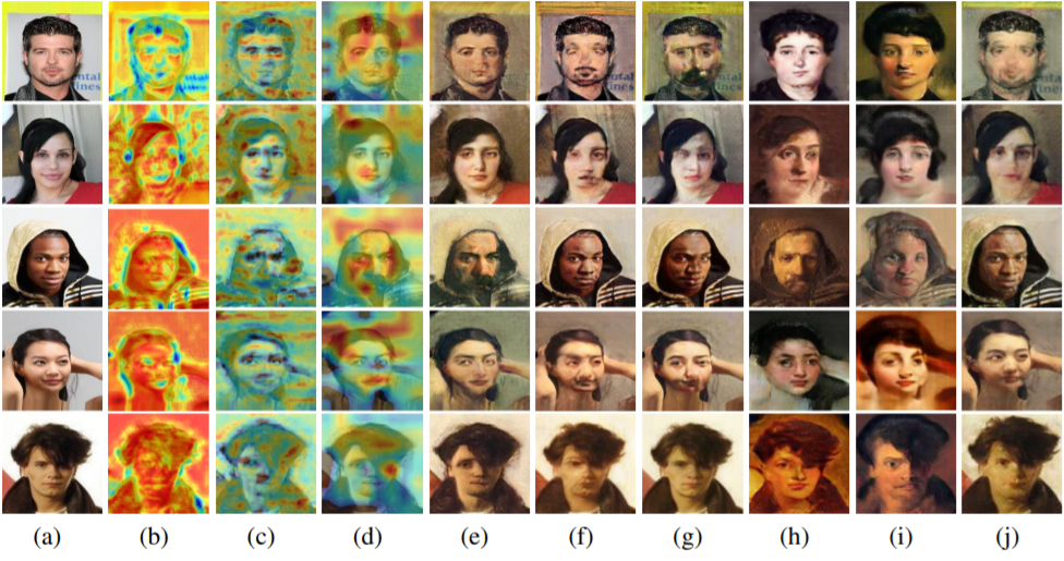 Visual comparisons of the photo2portrait with attention features maps. (a) Source images, (b) Attention map of the generator, (c-d) Local and global attention maps of the discriminators, respectively, (e) Our results,(f) CycleGAN (Zhu et al. (2017)), (g) UNIT (Liu et al. (2017)), (h) MUNIT (Huang et al. (2018)), (i) DRIT (Lee et al. (2018)), (j) AGGAN (Mejjati et al. (2018)).