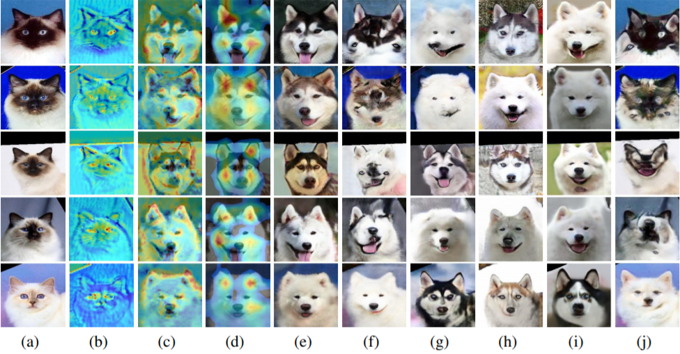 Visual comparisons of the dog2cat with attention features maps. (a) Source images, (b) Attention map of the generation, (c-d) Local and global attention maps of the discriminators, (e) Our results, (f) CycleGAN (Zhu et al. (2017)), (g) UNIT (Liu et al. (2017)), (h) MUNIT (Huang et al. (2018)), (i) DRIT (Lee et al. (2018)), (j) AGGAN (Mejjati et al. (2018)).