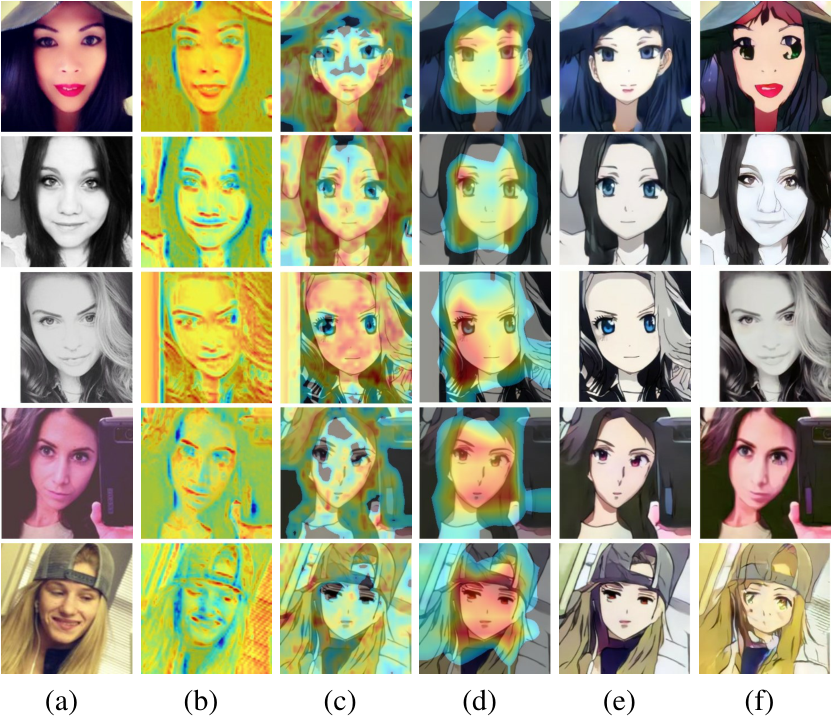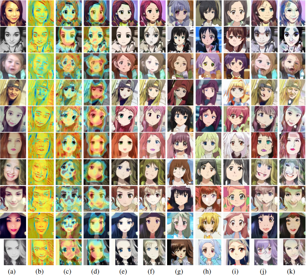 Visual comparisons of the selfie2anime with attention features maps. (a) Source images, (b) Attention map of the generator, (c-d) Local and global attention maps of the discriminators, (e) Our results, (f) CycleGAN (Zhu et al. (2017)), (g) UNIT (Liu et al. (2017)), (h) MUNIT (Huang et al. (2018)), (i) DRIT (Lee et al. (2018)), (j) AGGAN (Mejjati et al. (2018)), (k) CartoonGAN (Chen et al. (2018)).