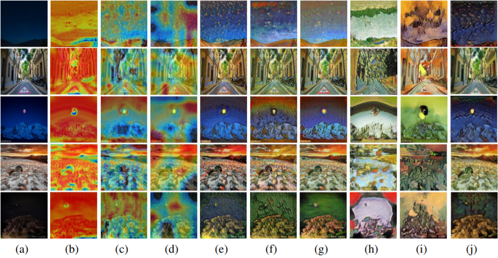 Visual comparisons of the photo2vangogh with attention features maps. (a) Source images, (b) Attention map of the generation, (c-d) Local and global attention maps of the discriminators, respectively, (e) Our results, (f) CycleGAN (Zhu et al. (2017)), (g) UNIT (Liu et al. (2017)), (h) MUNIT (Huang et al. (2018)), (i) DRIT (Lee et al. (2018)), (j) AGGAN (Mejjati et al. (2018)).