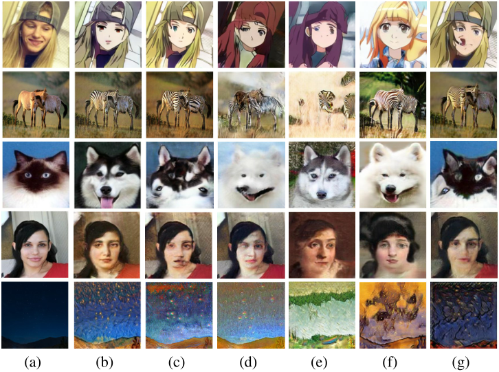 Visual comparisons on the five datasets. From top to bottom: selfie2anime, horse2zebra, cat2dog, photo2portrait, and photo2vangogh. (a)Source images, (b)U-GAT-IT, (c)CycleGAN, (d)UNIT, (e)MUNIT, (f)DRIT, (g)AGGAN