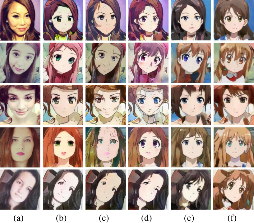 如下图所示,CartoonGAN只是将图像的整体颜色改变为动画风格,但与自拍相比,眼睛这一动画的最大特点却没有任何改变。因此,CartoonGAN有更高的KID。