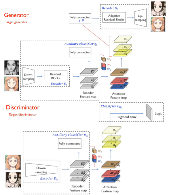 2.注意模块通过基于辅助分类器获得的attention map来区分源域和目标域,从而帮助模型知道在哪里进行集中转换。