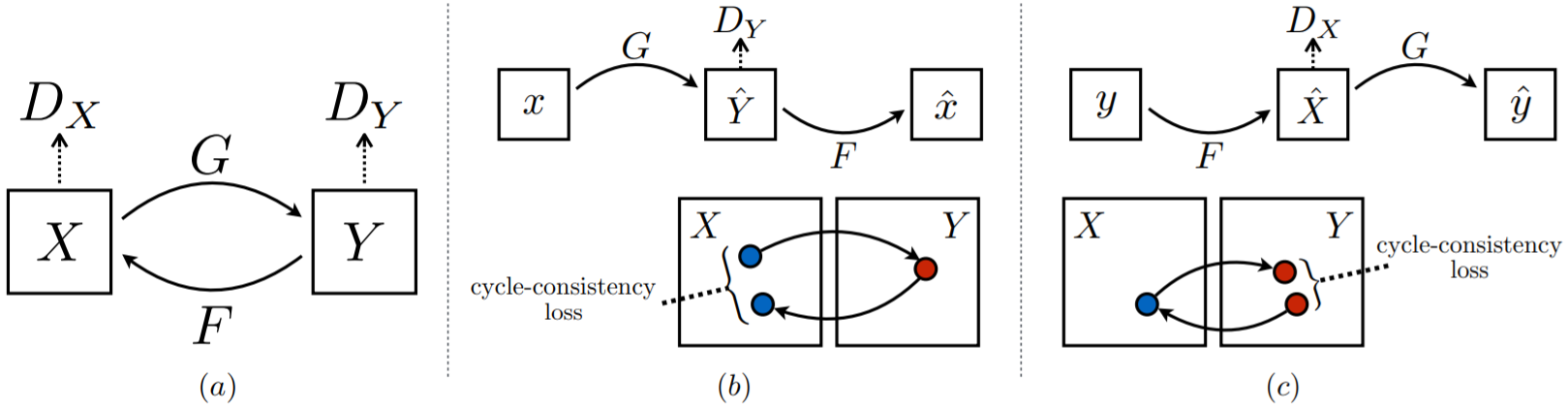 CycleGAN基础网络框架:使用一个对抗损失函数,学习映射 G G G: X → Y X \to Y X→Y以及其判别器 D Y {D_Y} DY,使得判别器 D Y {D_Y} DY难以区分生成的图片 G ( X ) G(X) G(X)与目标图片 Y Y Y。由于这样的单向映射收到巨大的限制,所以新添加一个相反的映射 F F F: Y → X Y \to X Y→X以及其判别器 D X {D_X} DX,使它们成对,同时加入循环一致性损失(Cycle Consistency Loss),以确保前向循环一致性损失 x → G ( x ) → F ( G ( x ) ) ≈ x x \to G(x) \to F(G(x))\approx x x→G(x)→F(G(x))≈x,反向循环一致性损失 y → F ( y ) → G ( F ( y ) ) ≈ y y \to F(y) \to G(F(y))\approx y y→F(y)→G(F(y))≈y。